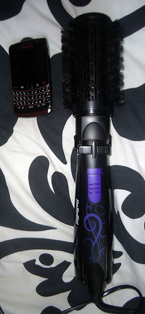 It's basically a hot air brush that rotates to mimic the results of a blow dry. Personally I've never been able to blow dry my hair but I've always admired the way stylists do it. The brush it self is huuuuge (see below how it sizes up to my BlackBerry!) and it has three heat settings including a 'cool shot'.